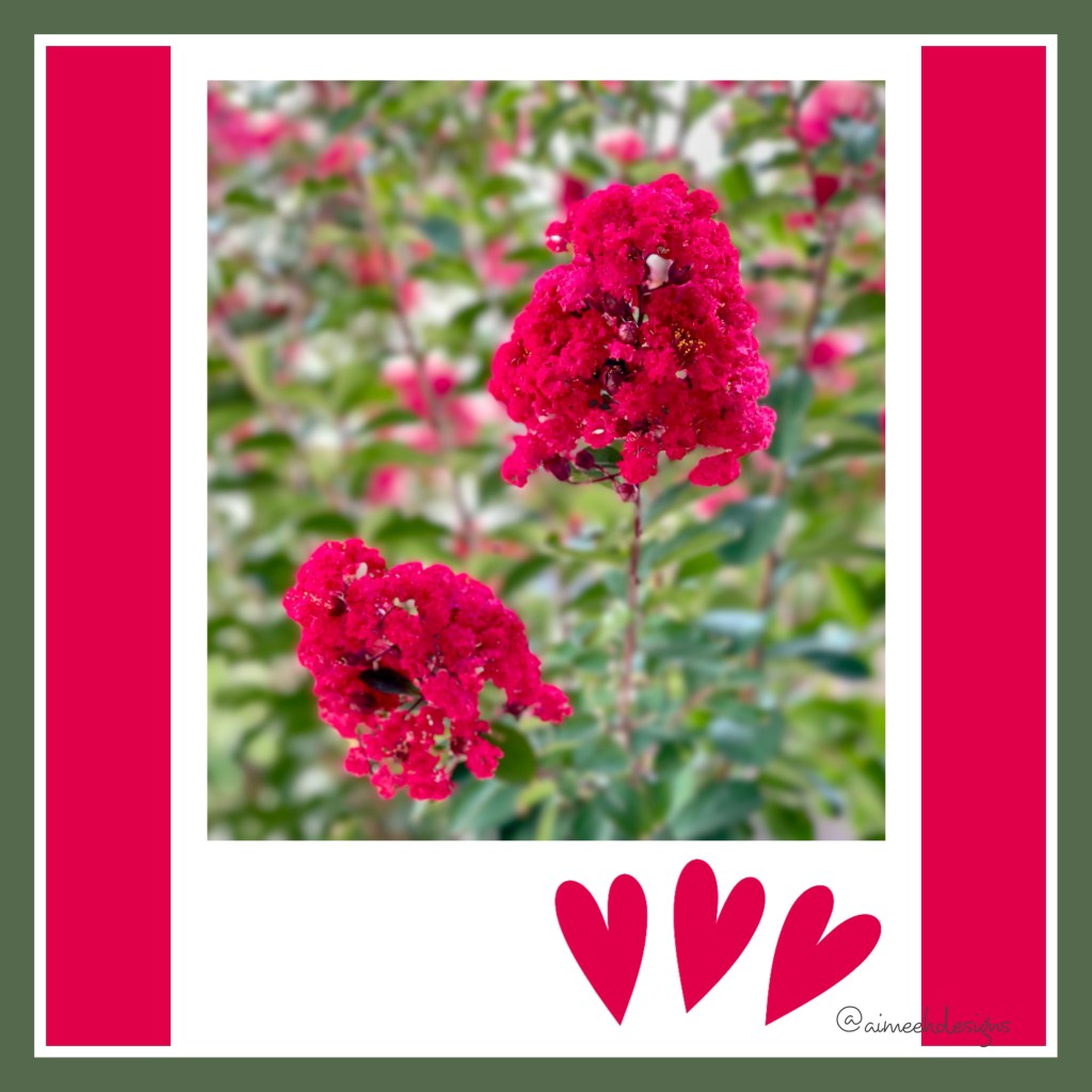 I couldn’t get over the vibrance and uniqueness of these flowers in my neighbor’s front yard! I had to snap a pic (with my iPhone 12 Pro Max). So gorgeous! The color is indescribable. Crepe myrtles are different to begin with and this color is fabulous. Enjoy! Stop and look at nature. 🌺 #natureiphonephotography #aimeehdesigns #crepemyrtleflowers #picsartdesign